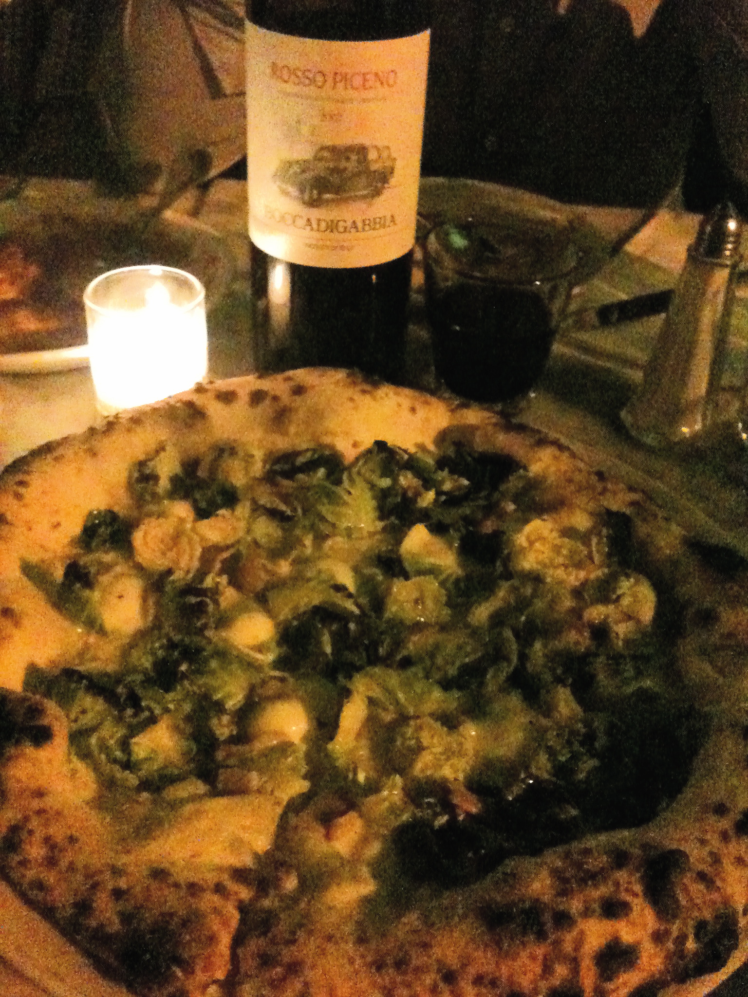 The pizza was awesome. Doughy but thin crust with a little char. The octopus app was delish, the meatball was OK. I got the Brussels Sprouts Pizza. MMm MMMm MMMm. And our bottle of red was packed with nice fruit and a few questionable decisions. Thanks Motorino!