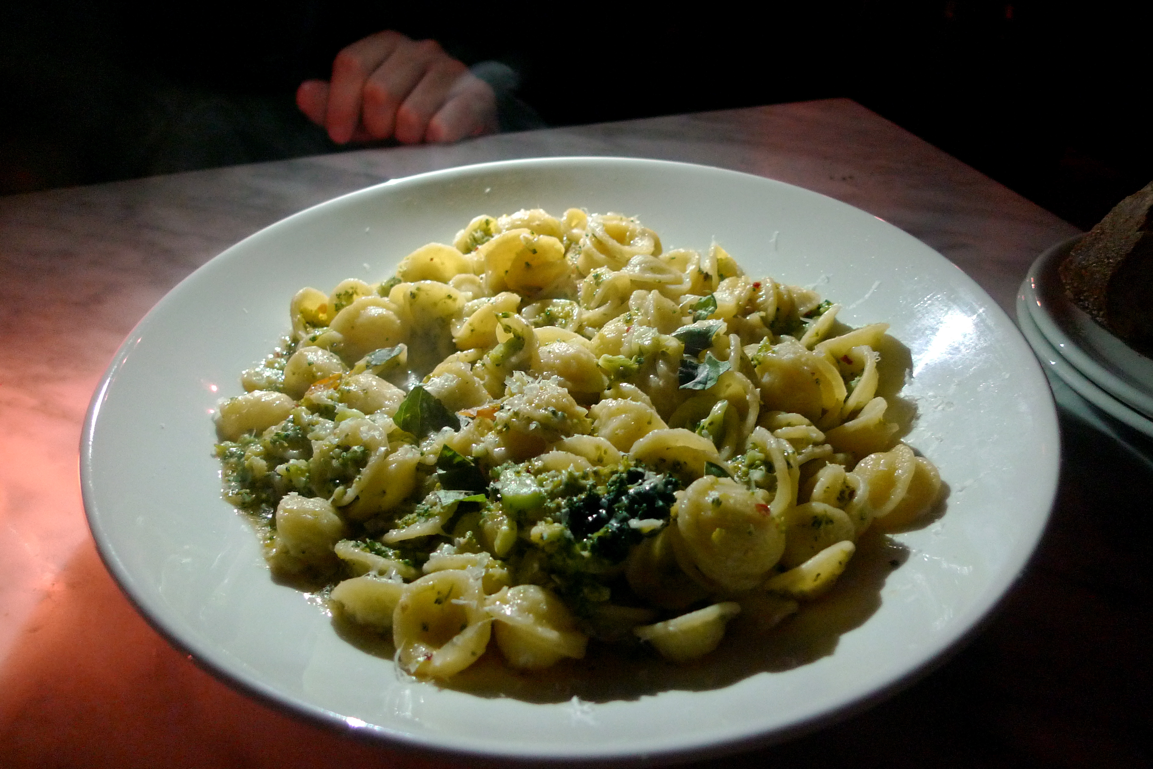 Orecchiette with broccoli, cherry tomatoes, and chilies – could barely detect the tomatoes and found no trace of chilies but it was OK.