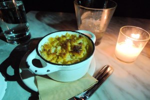 We went to Eveleigh on Sunset in West Hollywood. It’s indisputably a gorgeous space. The lighting is super dim, (I moved a candle a bit to check out what our dishes looked like before diving in.), and the seating is a little annoying as the booths are slightly unsecured so you can feel the guy five tables down shift his leg since it’s technically the same piece of padded wood you’re sitting on. But the cocktails were killer, the decor is beautiful, and the food was not bad.